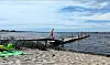 Ein Badesteg führt bei Ballebro in oft wellige und tiefe Fluten.