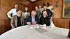 Der Tag der Vertragsunterzeichnung: Towii-Direktor Oliver Wolgast, der Vorsitzende von Tønder Vedvarende Energi A/S, Anton Schulz, und die Direktorin von Tønder Vedvarende Energi A/S, Trine Hadrup. Im Hintergrund schauen Søren Kjær (Towii Renewables A/S) und die Vorstandsmitglieder Anita Uggerholt Eriksen (stellvertretende Vorsitzende), Torben Struck sowie Poul Erik Kjær (v. l. ) zu, als die Unterschriften geleistet werden.