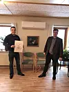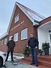 Ausschussvorsitzender Philip Tietje (l.) und Rasmus Jensen vor dem Versammlungshaus in Bülderup, das mithilfe von Zuschüssen saniert und energetisch optimiert werden konnte