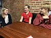 Ella, Jonna und Rasmus (v. l.) beim munteren Plausch im Vorraum der Bauer Schwimmhalle