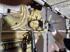 Mit Pinsel und Staubsauger werden die reichen Holzschnitzereien gesäubert.