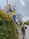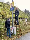 Papa Kurt hilft beim Anbringen der Wahlplakate. Mindestens 2,30 Meter hoch müssen sie hängen, wenn sie über Geh- und Fahrradwegen platziert werden.
