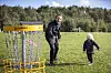 Der Frisbee, die Kim Gude Hansen geworfen hat, landet direkt im Korb. Tochter Freja freut sich über den Treffer des routinierten Papas.