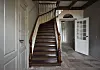 Der Treppenaufgang zum ersten Stock: Die Treppe ist abgeschliffen und neu lackiert worden. Es läuft sich darauf wie auf einem Teppich, so weich federt das Holz die Schritte ab. Durch die Türen links und im Hintergrund geht es in die Erdgeschossräume, die inzwischen schon vermietet sind. Über den steinernen Boden sind viele Generationen der Marcussen-Familie und deren Angestellte gegangen.