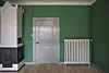 Mehrere Kachelöfen sind in den Räumen geblieben. Die Heizkörper sind gereinigt und neu gestrichen worden. Die Heizungsrohre sind in der Wandfarbe gehalten, Türen und Decken abgesetzt. Der Boden ist frisch geschliffen und geölt.