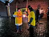 Mit blinkendem, rotem Licht wie auf einer Windkraftanlage, Bannern, Knicklichtern und Fackeln wurde demonstriert.