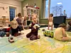 Die Kinder der Krippen-Gruppe sind zwischen null und drei Jahre alt und beäugen die Malaktion erst einmal sehr skeptisch. Vor ihnen auf dem Boden liegt ein großes Blatt Papier. Bis jetzt ist das Blatt noch weiß – doch das wird nicht lange so bleiben. Surkus fängt an, die Farben auf das Blatt zu spritzen. Die Farbflasche macht dabei ein paar Pups-Geräusche, was die Kinder zum Kichern bringt.