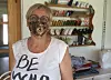 Mitarbeiterin näht Gesichtsmasken