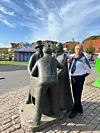 Jørgen Bork Hansen bei der Statue von Alice Buchhave, die Pastor Anders Bork Hansen, den Rattenfänger Cibrino und einen unbekannten Landstreicher aus Schweden mit einem Leierkasten zeigt.