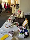 Im Touristikbüro gab es eine unvergängliche und kalorienlose Kaffeetafel. Im Hintergrund herrscht Andrang beim Abholen der Tickets für die Kuchenroute durch die Fußgängerzone.
