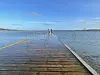 Das Wasser stieg in der Apenrader Förde so hoch, dass auch der Steg am Süderstrand fast vollständig überflutet wurde. Normal liegt er bei Flut etwa einen Meter über dem Meeresspiegel.