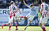 Kristall Mani Ingason verwandelte vom Elfmeterpunkt und verhöhnte anschließend – wenig sympatisch – die AaB-Fans, die weiter auf ihre Aufstiegsparty warten müssen.