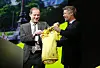 Tour-Direktor Christian Prudhomme (l.) bietet Kronprinz Frederik das Gelbe Trikot an.