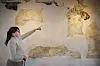 Museumsinspektorin Nynne Sanderbo Martinusen an der Wand, wo die Kalkmalereien befestigt werden