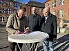 Lars Martens Clausen, Vorstandsvorsitzender von „CJ A/S“ (links), Hans Jørgen Ebbesen, Direktor von CJ A/S und Bürgermeister Mads Skau (Venstre, rechts im Bild) bei der Vertragsunterzeichnung zum Wochenstart. Die Kaufsumme liegt bei gut 1,5 Millionen Kronen.