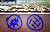 Ein Hakenkreuz und ein durchgestrichener Davidstern sind an einer Gedenkstätte zu sehen.