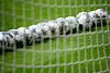 Fußbälle liegen in einem Tor.