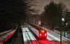 Eine S-Bahn verlässt bei leichtem Schneefall den Bahnhof Wandsbeker Chaussee.