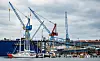Wolken ziehen über die Kräne der „Nobiskrug“-Werft an der Förde.
