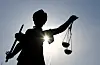 Eine Statue der Justitia mit einer Waage und einem Schwert in ihren Händen.