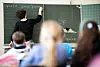 Eine Lehrerin schreibt in einer Schule an die Tafel.