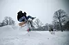 Junge Schlittenfahrer springen über eine Schanze im tief verschneiten Hamburger Schanzenpark. (Archivbild)