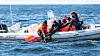 Ein Netz wird an Bord eines Schnellschiffes gezogen.