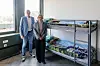 Bezirksamtsleiter Michael Werner-Boelz und Gesundheitssenatorin Melanie Schlotzhauer (SPD) besichtigen einen für Flüchtlinge eingerichteten Wohnraum in der leerstehende Postbank-Zentrale in der City Nord.