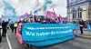 Streikende ziehen während eines Warnstreiks in der Tarifrunde hinter einem Transparent.