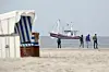 Ein Krabbenkutter vor dem Strand von St. Peter-Ording.
