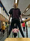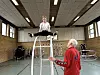 Björg hilft Kristjana beim Binden des korrekten Rhönrad-Schuhwerks.