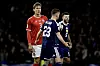 Danmarks Jannik Vestergaard i aktion med Skotlands Kenny McLean og Grant Hanley under VM-kvalifikationskampen mellem Skotland og Danmark på Hampden Park i Glasgow tirsdag den 18. november 2025.