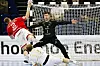 Hendrik Pekeler setzt sich gegen die Deckung von Aalborg Håndbold durch.