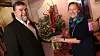 Walzenmühle-Chef Sönke Petersen überreicht Organisatorin Jutta Rosenthal einen Blumenstrauß.