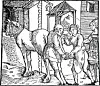 „Ein solicher Hofman waz Ulenspiegel, daz sein Frumkeit [Tüchtigkeit] vor manchen Fürsten und Herren kam und daz man wol wüßt von ihm ze sagen. Daz möchten die Herren und Fürsten wol leiden und gaben ihm Kleid, Pferd, Gelt und Kost. Also kam er zu dem Künig von Dänmarck und der het ihn vast [sehr] lieb und bat ihn, daz er etwaz Abentür macht, er wolt ihm sein Pferd laßen beschlagen von dem allerbesteb Huffschlag. Ulenspiegel fragt den Künig, ob er solt seinen Worten glauben. Der Künig sprach ja, dann er nach seinen Worten thät. Ulespiegel reit mit seinem Pferd zum Goldschmid und ließ sein Pferd mit guldin Huffeisin und mirt silbern Näglen beschlagen und gieng da zum Künig und sprach:, daz er ihm wolt den Huffschlag bezalen. Der Künnig sprach ja, und sprach zu dem Schreiber, daz er ihm den Huffschlag thät bezalen. So meint der Schreiber, das es ein schlechter [schlichter] Huffschmid wär, und Ulenspiegel bracht ihm zu dem Goldschmid. Und der Goldschmid wolt haben 100 dänische Marck. Der Schreiber wolt das nit bezalen und gieng hin und sagt das dem Künig. Der Künig ließ Ulenspiegel holen und saget da zu ihm: „Ulenspiegel, was deuren Huffschlag machst du. Wann ich alle meine Pferd soll also beschlagen lassn, so müßt ich bald Land und Lüt verkauffen. Das was mein Meinung nit, daß man das Pferd ließ mit Gold beschlagen.“ Ulenspiegel der sprach: „Gnädiger Künig, Ihr sagten, das solt der best Hufschlag sein ond ich solt Euwern Worten Gnug thun.“ Der Künig sprach: Du bist mein allerliebster Hoffgesind. Du thust, was ich dich hieß“, und ward lachen und bezalt die 100 Marck. Da kam Ulenspiegel und ließ die guldnen Eisen abbrechen und zoch für die Schmidt und ließ sein Pferd mit Eißin beschlagen und bleib bei dem Künig biß an sein End [bis zum Tode des Königs].“