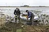 Naturschutzspezialist Jesper Tofft (links) und Karl Benne von der Kommune Tondern haben Donnerstag zehn Brutflöße für seltene Trauerseeschwalben auf dem Bremsbüller See verankert.