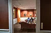 Gäste der Ausstellung haben es sich auf dem Sofa gemütlich gemacht und reden miteinander.
