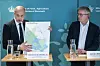 Umweltminister Magnus Heunicke (Soz., links) und Fischereiminister Jacob Jensen (Venstre) mit einer Karte der Gebiete, in denen die Fischerei mit Grundschleppnetzen verboten werden soll