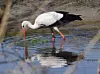 Die Störchin nutzt die neu angelegte Wasserstelle auf dem Feld.