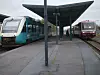 Die Bahngesellschaft Arriva bedient demnächst mit ihren Triebwagen (Foto links) auch eine neue Haltestelle in Bosbüll zwischen Tondern und Niebüll. Auf dem Foto ist rechts ein Triebwagen der NEG Niebüll zu sehen, der Eigentümerin der Strecke zwischen der deutsch-dänischen Grenze und Niebüll. Der NEG-Triebwagen kommt zuweilen als Ersatzfahrzeug nach Tondern.