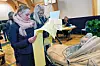 Zwei Wählerinnen in den Tondernhallen beim Betrachten der Wahlzettel.