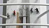 Spezialisten klettern an der Außenseite des Spinnaker Towers» und streichen den Aussichtsturm im Hafen.