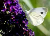 Der Karstweißling saugt an einem Schmetterlingsstrauch Blütennektar.