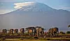 Eine Elefantenherde streift bei Sonnenaufgang im Amboseli-Nationalpark über eine Ebene. Im Hintegrund: der Kilimandscharo.